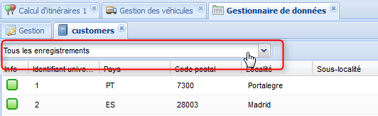 Si dans le cas d'application Gestionnaire de données, vous avez créé des bases de données clients, vous pouvez effectuer une recherche sur un client dans le calcul d'itinéraires et reprendre l'adresse comme étape.