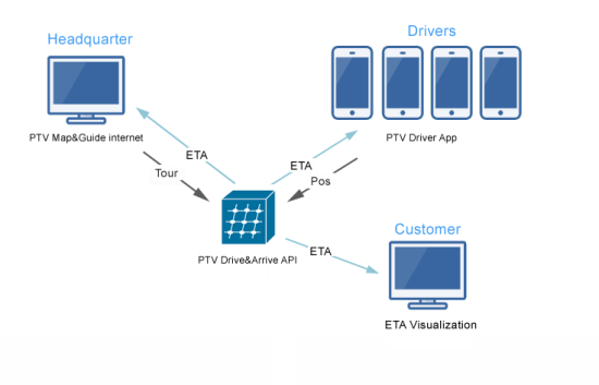 In PTV Map&Guide intranet können Sie den Dienst PTV Drive&Arrive nutzen, der allen Beteiligten in einem Transportzyklus die erwartete Ankunftszeit (ETA = Estimated Time of Arrival) in Echtzeit zur Verfügung stellt.
