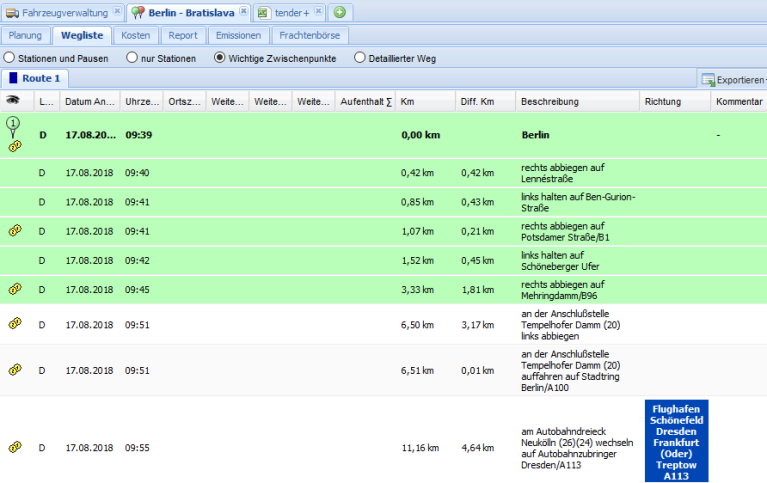 Im Register Wegliste erhalten Sie eine detaillierte Streckeninformation zu Ihrer Route. Die Wegliste enthält Angaben zur Uhrzeit, zu welcher der nächste Wegpunkt erreicht wird, aktuell zurückgelegte Kilometer und Fahrtzeit am jeweiligen Wegpunkt, eine Beschreibung zur Wegführung und Richtungsangaben.