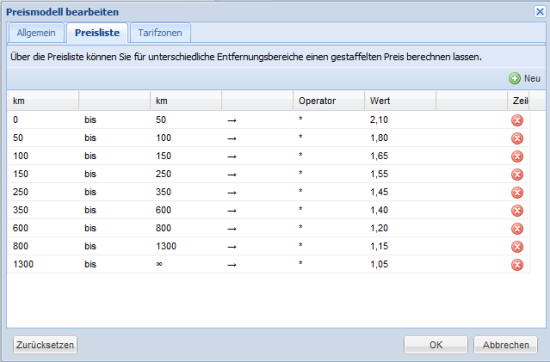 Im Register Preisliste können Sie die Kilometerbereiche in der Tabelle anpassen oder neu erstellen und den Operator und Wert festlegen.