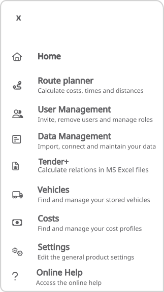 Note: Access to the application menu is not possible if you edit a cost or vehicle profile. This is to prevent changes getting lost due to the change of module.