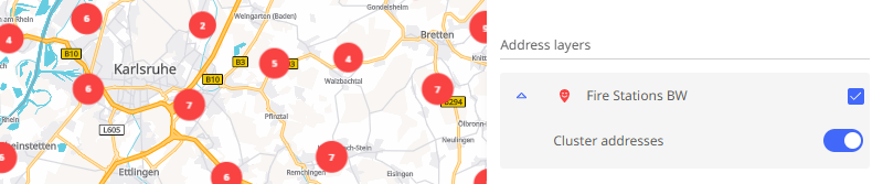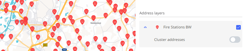 If you have created address layers via theData management module, these are displayed under the available map layers. You can activate address layers via the "Map layers" menu. Display addresses as clustersIf an address layer contains many addresses, e.g. in a metropolitan area, the map view can become confusing.