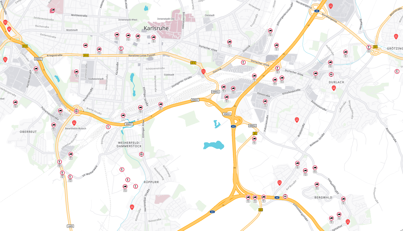 In the map view, you can enable additional layers to better plan your route. Multiple layers can be displayed simultaneously. The button