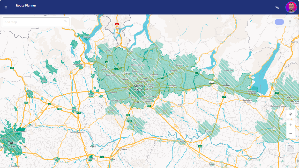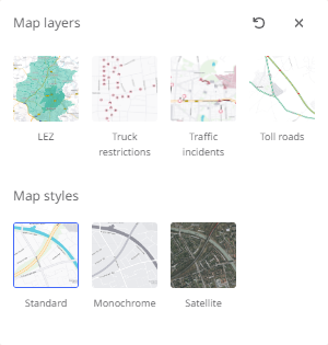 The Environmental Zones layer shows zones in many European cities. This helps with planning and selecting the appropriate vehicle. You can show the layer in the “ Map layers ” menu. |