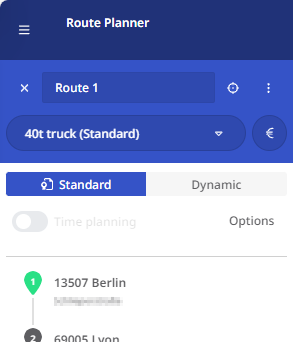 On the right, you’ll find information on distance, time, cost, and emissions – depending on the selected calculation mode and the settings for each stop and the vehicle and cost profile.