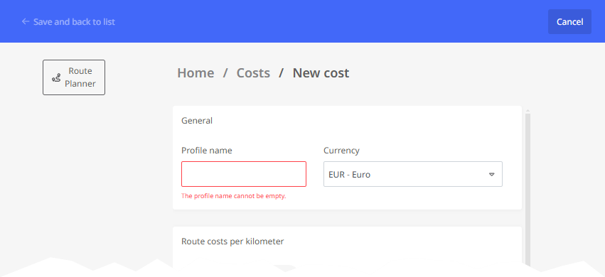 If you use the routing setting for cost-optimised routing, please ensure that you set accurate values in this area of the cost profile, as these values have a direct effect on the calculation of your route.