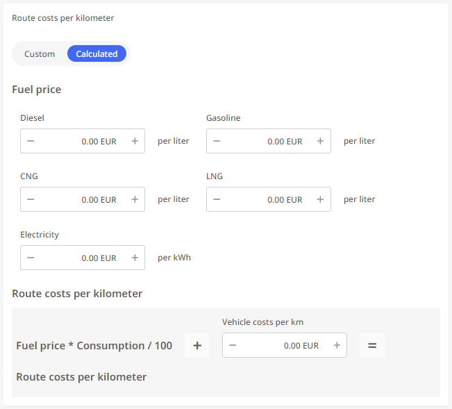 Here you can enter your own costs for the route per kilometer. Note: Routing setting "Cost-optimized routing"