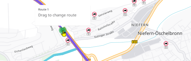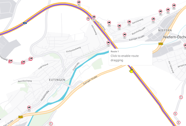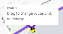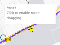 If you have calculated a route in dynamic mode, you can also change the course of the route via drag & drop. This enables you to guide the route via certain roads (e.g. to bypass a specific area), even if this does not correspond to the optimal route calculated.