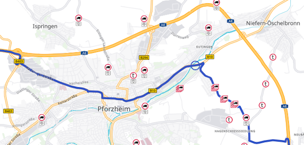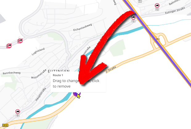 Your route is now recalculated. When you zoom in into the affected area again, you can see the new course of the route. You may need to add several via points until the route of the route meets your wishes. |