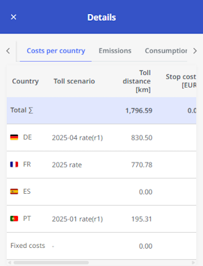 By clicking on the “Costs per country” information box, you will see the calculated costs for the route broken down by country and listed in a table. The table can be scrolled sideways, with the first column containing the country code and flag fixed in place. The table contains the following information: