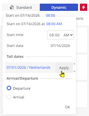Note: If you calculate your route(s) in dynamic mode, you can set the date so that the future toll costs apply by selecting the departure/arrival time using the "Toll data" -> < Apply > function. This means that the effective date of the new toll costs is taken as the reference date. You can of course also manually set a date after this reference date. |