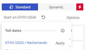 If you calculate your route(s) in standard mode, you cannot select an individual departure or arrival date at this point, but you can still activate the calculation according to future tolls. This means that the calculation is still carried out in standard mode, but the start date is fictitiously set to the effective date of the new toll. You can deactivate this setting again using the "Reset" |