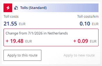 Example: In the example shown here, reference is made to a planned toll increase in the Netherlands on 1.7.2026. With <Update route> the start date for the calculated route is set to 1.6.2026. After recalculating the route, the toll costs are then displayed under "Details" with the future toll costs and without a note. With <Create new route>, the same route is created in parallel to the existing route (with the old start date) with 1.7.2026 as the start date, and both routes can be compared directly after the recalculation.