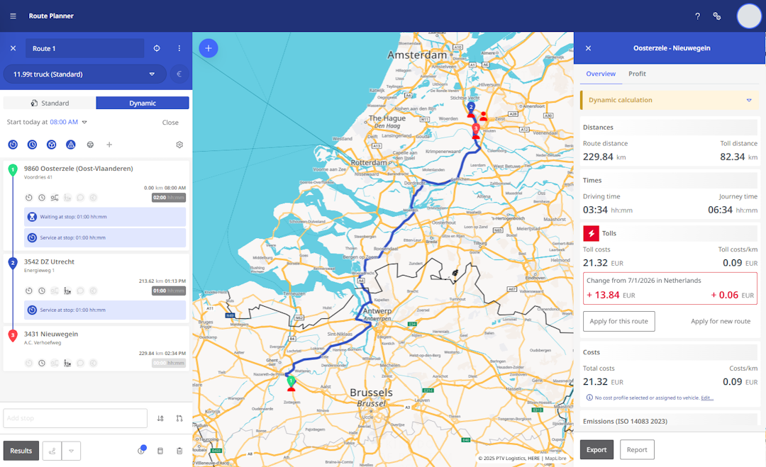 Once a route has been calculated, the details of the route (distances, times, costs, emissions) are displayed in the right-hand pane.