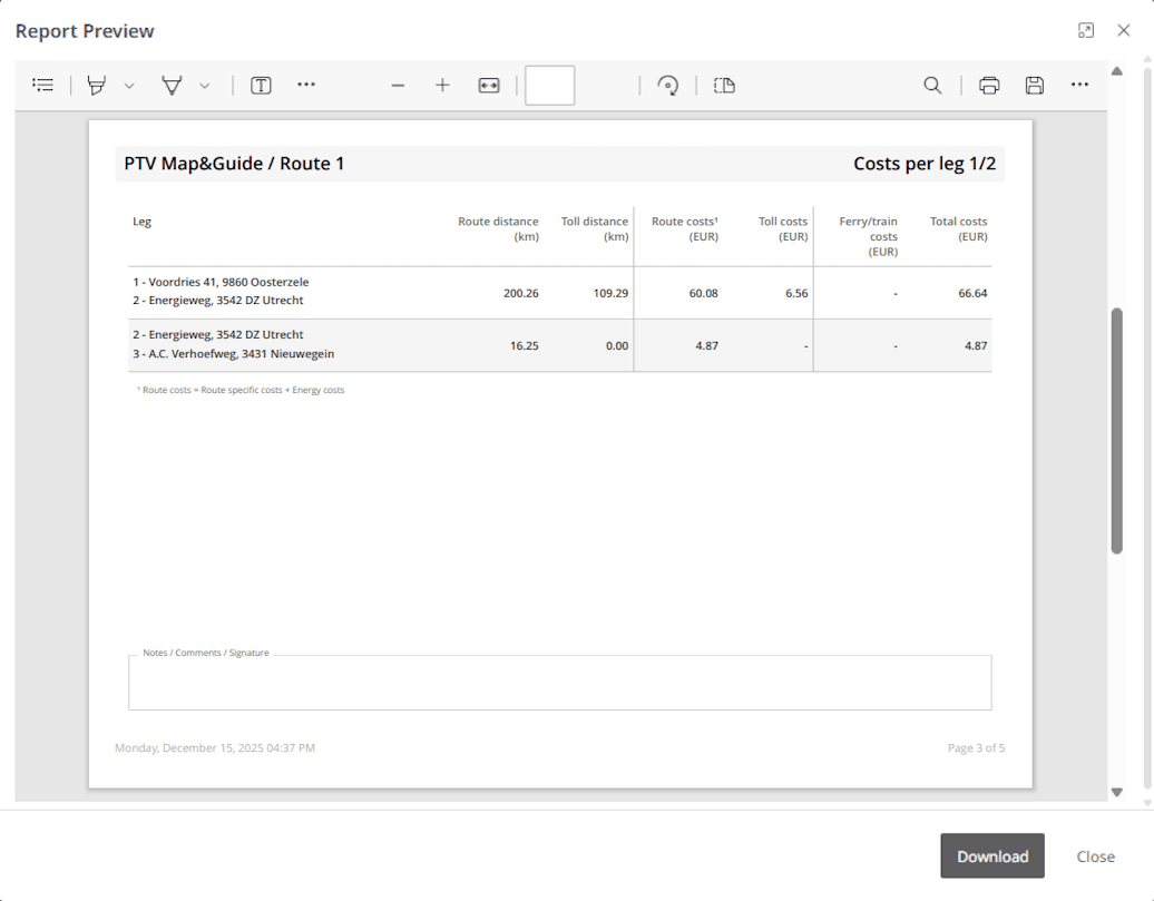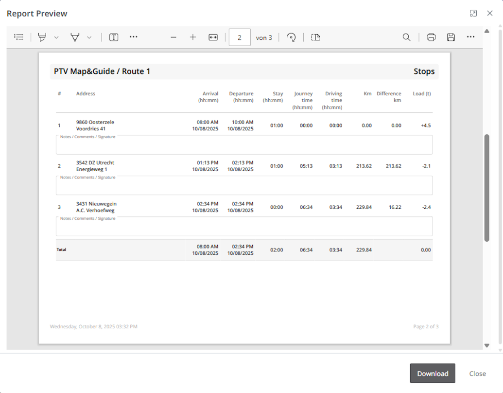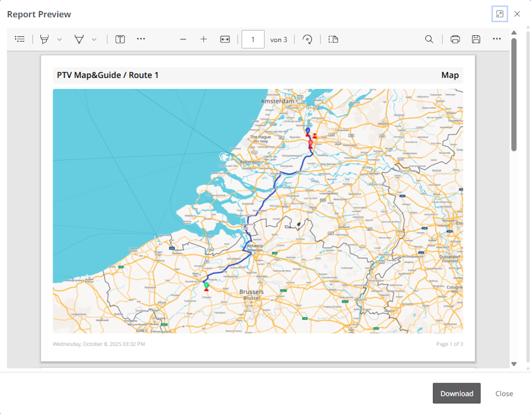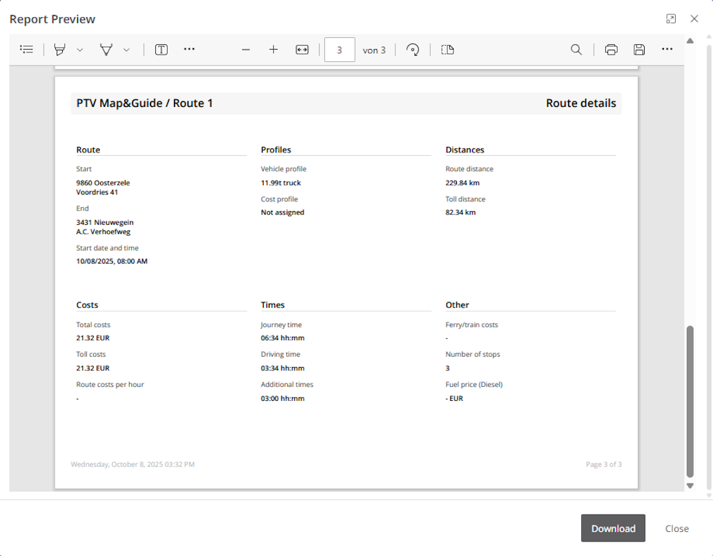 To make this information usable outside of PTV Map&Guide, you can also export it as a detailed report. You can either