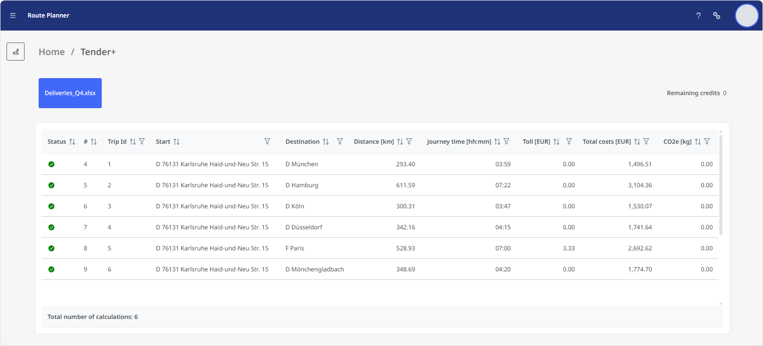 Once the calculation is complete, Tender+ displays the routes on the start page. Alternatively, you can download the results file to your computer.