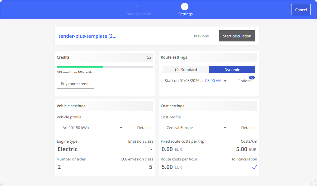 Define settings for the Tender+ calculation